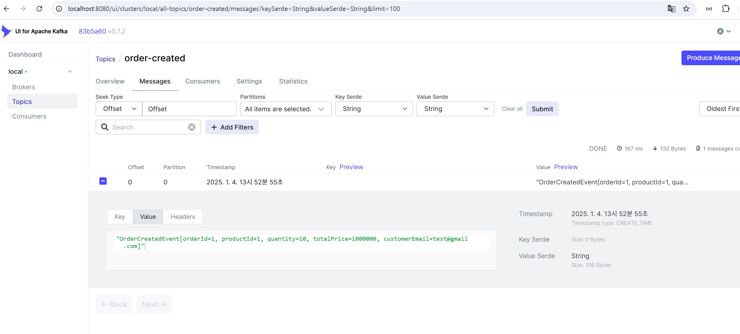 Kafka -UI 에 도 order-created 토픽에 이벤트가 동일하게 들어 있음을 확인할 수 있다.