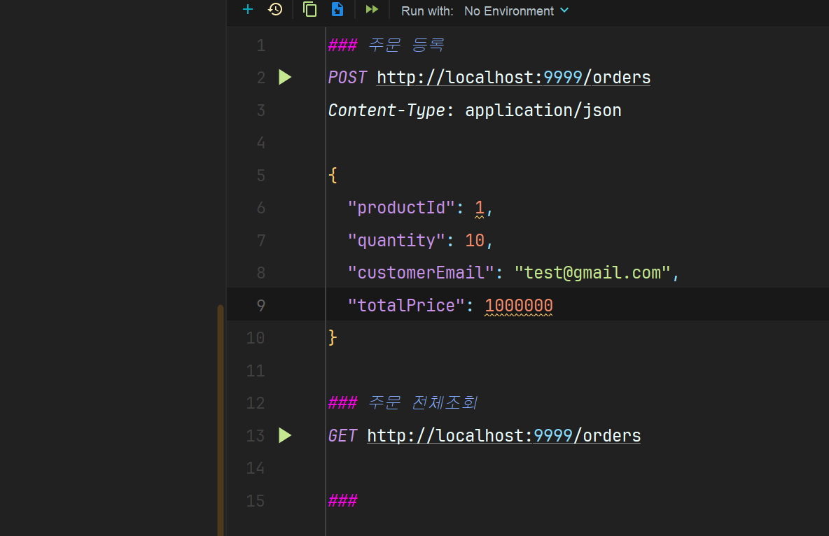 서버를 동작 시킨 후, 주문 등록을 호출해보자